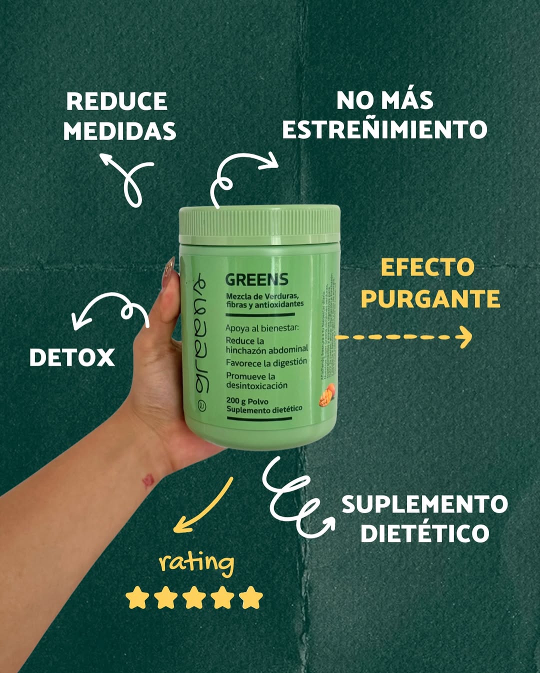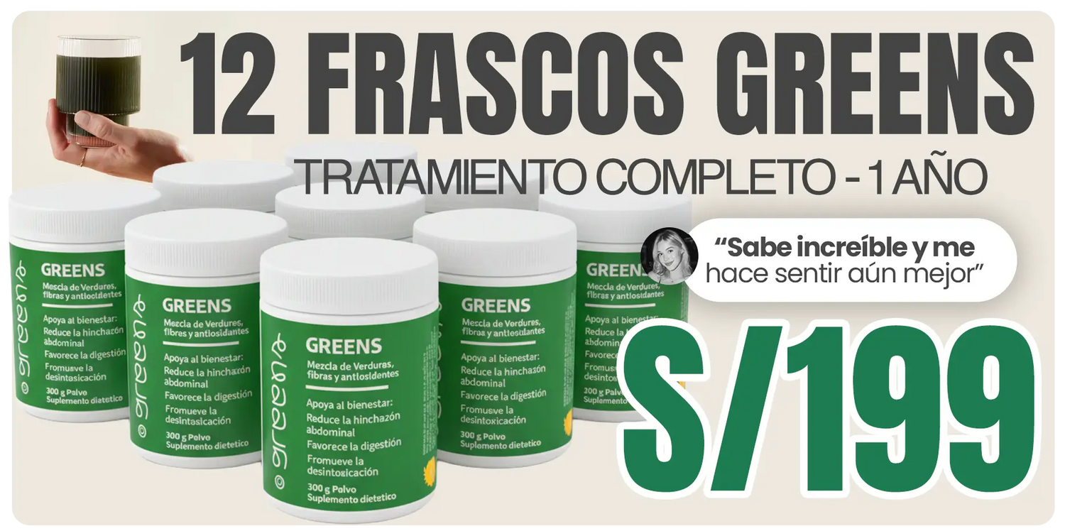 Greens aporta superalimentos y enzimas digestivas que alivian la hinchazón y mejoran la absorción de nutrientes. Favorece la pérdida de peso acelerando el metabolismo, ayuda a desinflamar el abdomen y brinda energía natural para sentirse más ligera y activa cada día.